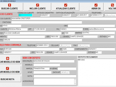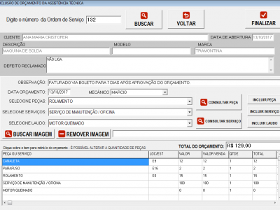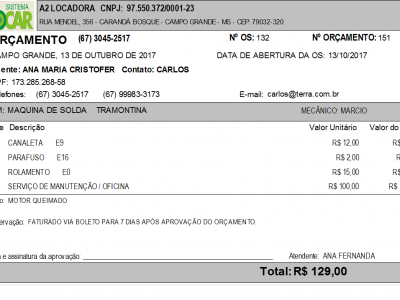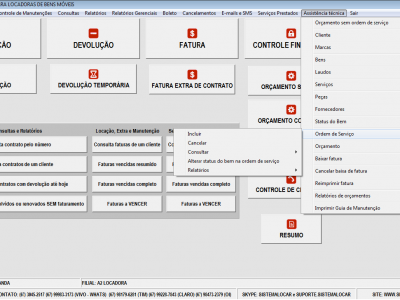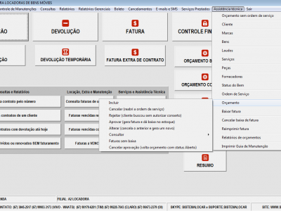 Mas em algumas situações a locadora também oferece o serviço de Assistência Técnica, ou seja, faz manutenções em bens de terceiros. Assim, o SISTEMALOCAR disponibiliza o módulo denominado Assistência Técnica, onde é possível abrir Ordens de Serviço, gerar orçamentos destas ordens e posteriormente fazer o faturamento.