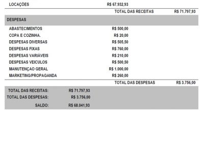 No controle financeiro serão gerados o FLUXO DE CAIXA e os DEMONSTRATIVOS DE RESULTADOS DO EXERCÍCIO (DREs).